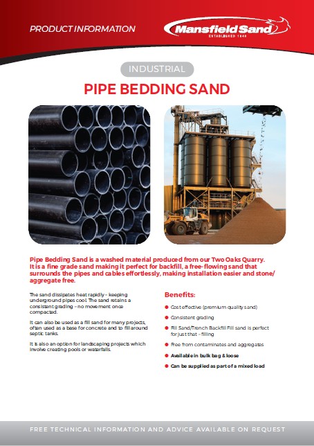 Pipe Bedding Sand is a washed material produced from our Two Oaks Quarry. It is a fine grade sand making it perfect for backfill, a free-flowing sand that surrounds the pipes and cables effortlessly, making installation easier and stone/aggregate free.