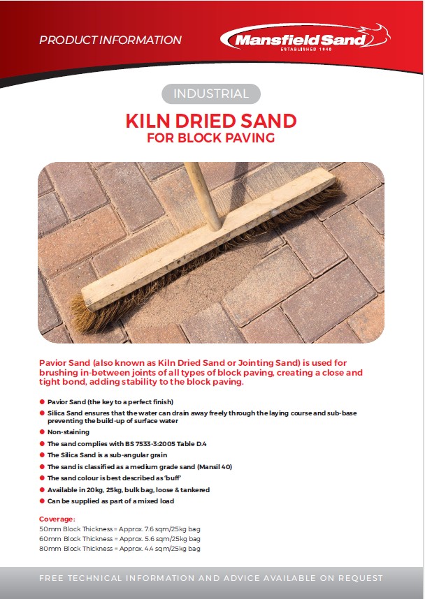 Pavior Sand (also known as Kiln Dried Sand or Jointing Sand) is used for brushing in-between joints of all types of block paving, creating a close and tight bond, adding stability to the block paving.