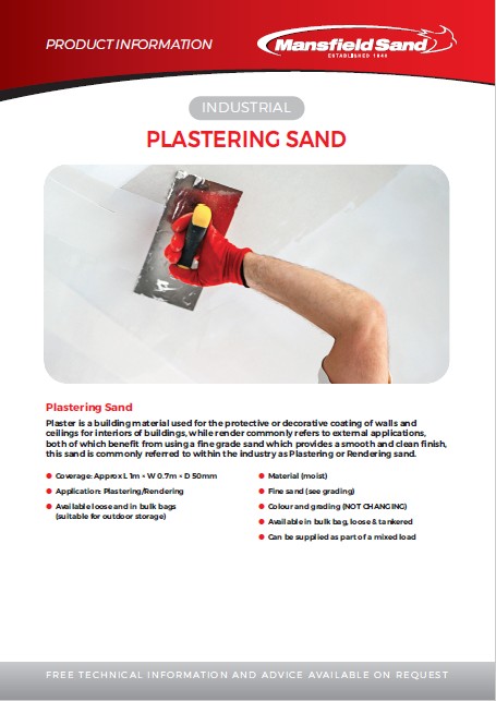 Plaster is a building material used for the protective or decorative coating of walls and ceilings for interiors of buildings, while render commonly refers to external applications, both of which benefit from using a fine grade sand which provides a smooth and clean finish, this sand is commonly referred to within the industry as Plastering or Rendering sand.