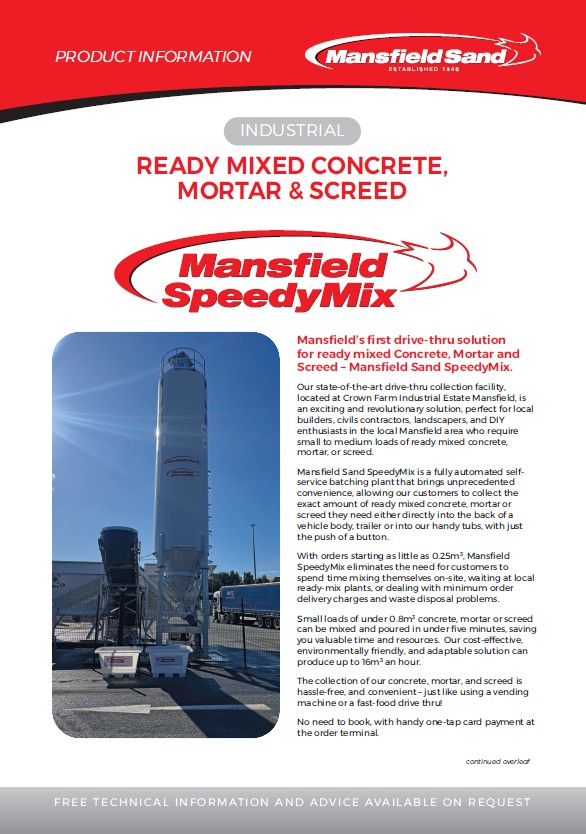 Mansfield Sand SpeedyMix is a fully automated self-service batching plant that brings unprecedented convenience, allowing our customers to collect the exact amount of ready mixed concrete, mortar or screed they need either directly into the back of a vehicle body, trailer or into our handy tubs, with just the push of a button.